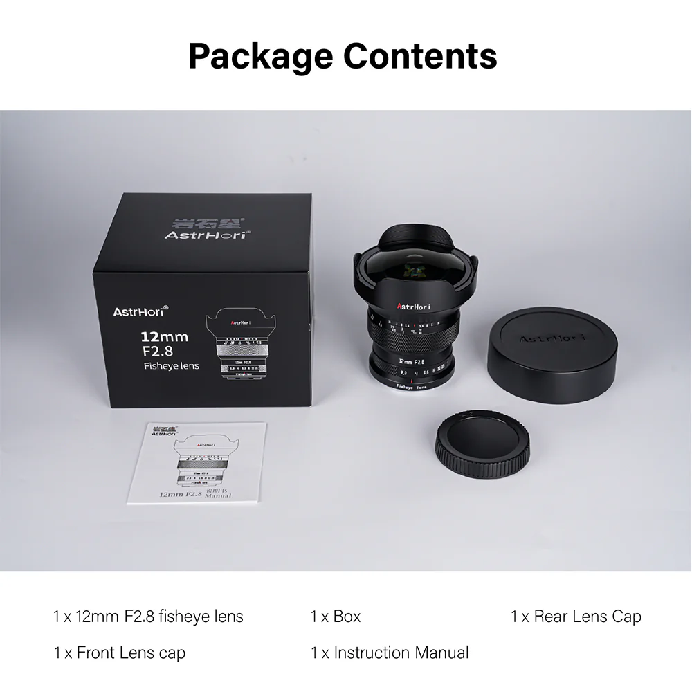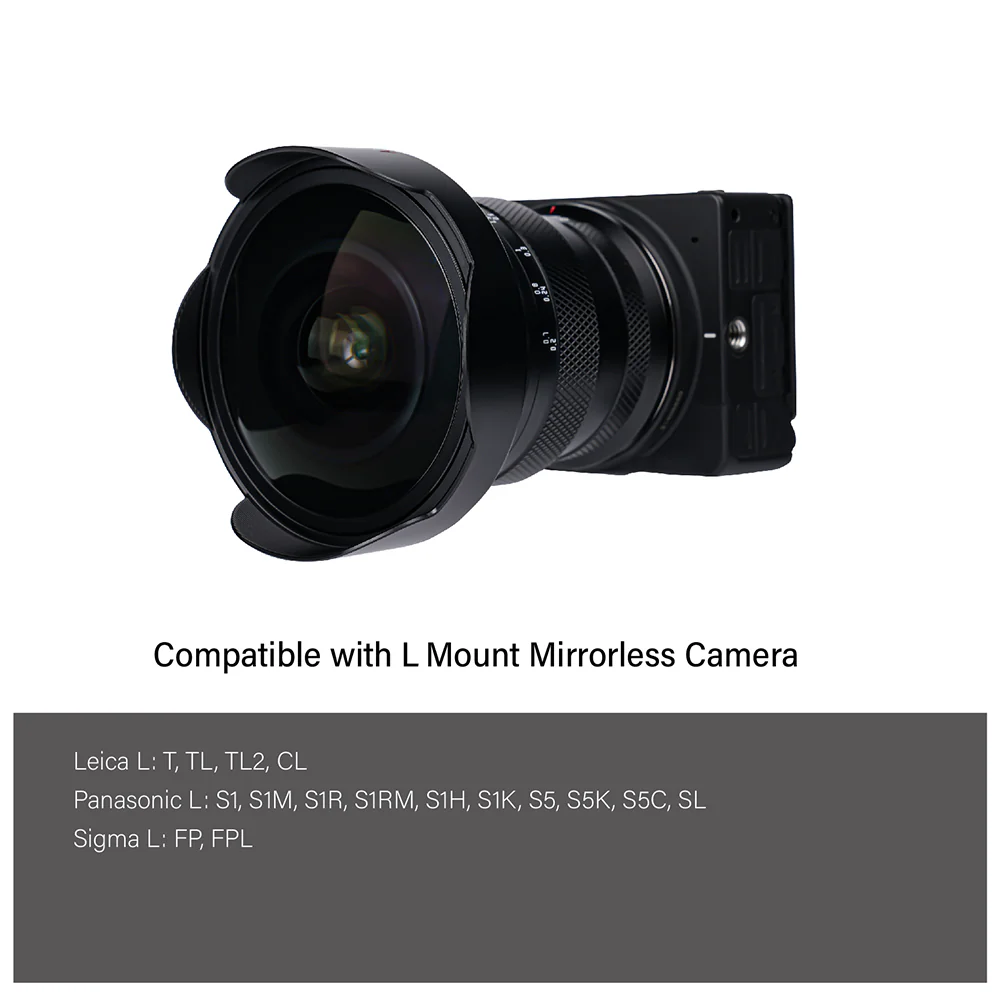 The AstrHori 12mm f/2.8 Fisheye Lens for Leica L-mount offers a 185° angle of view for unique perspectives and creative distortions. Ideal for starry sky photography, its large f/2.8 aperture minimizes noise in low light. The lens features 11 elements in 8 groups, enhancing edge-to-edge sharpness and reducing image degradation. Waterproof multilayer coatings on the glass elements suppress flare and ghosting, ensuring excellent contrast and color fidelity. With an all-metal body and a built-in petal-shaped hood, this lens is both durable and protective.