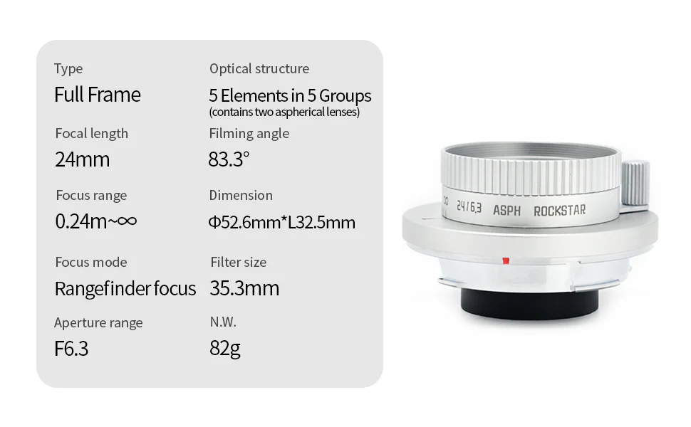 Hyperfocal shooting & Rangefinder focus –This 24mm F6.3 lens supports hyperfocal shooting,It can be easily achieved for close-range photography with a clear target, high-contrast lighting environment or landscape photography with large depth of field.And it adpot rangefinder focus.