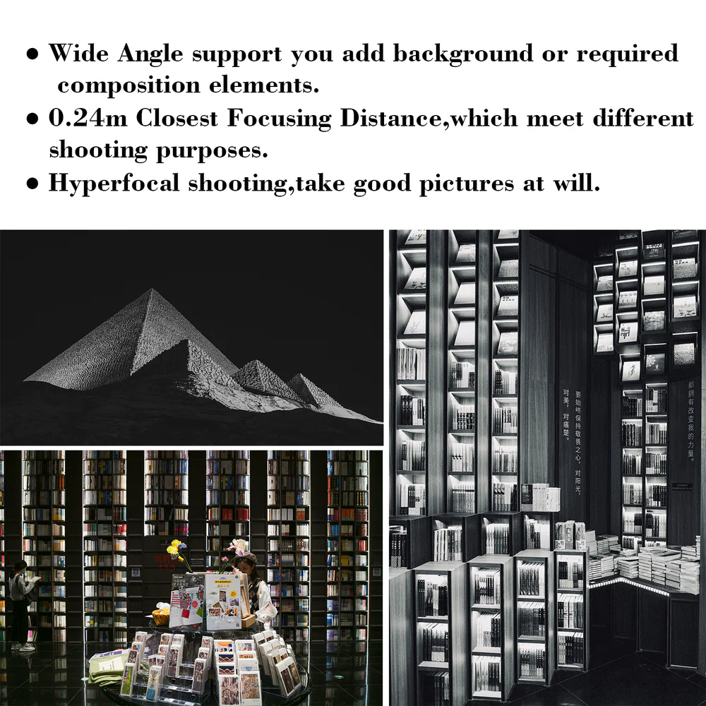 Wide Angle & Widely use –Highly recommanded 24mm focal length,quivalent to a small wide angle of about 35mm,it has greater flexibility for shooting different subjects.The closest focusing distance is 0.24m,which meet different shooting purposes.Available for subjects such as landscapes,architecture,big field of view,etc.With this wide angle,you can add background or required composition elements,such as group photos or indoor environments and portrait subjects.