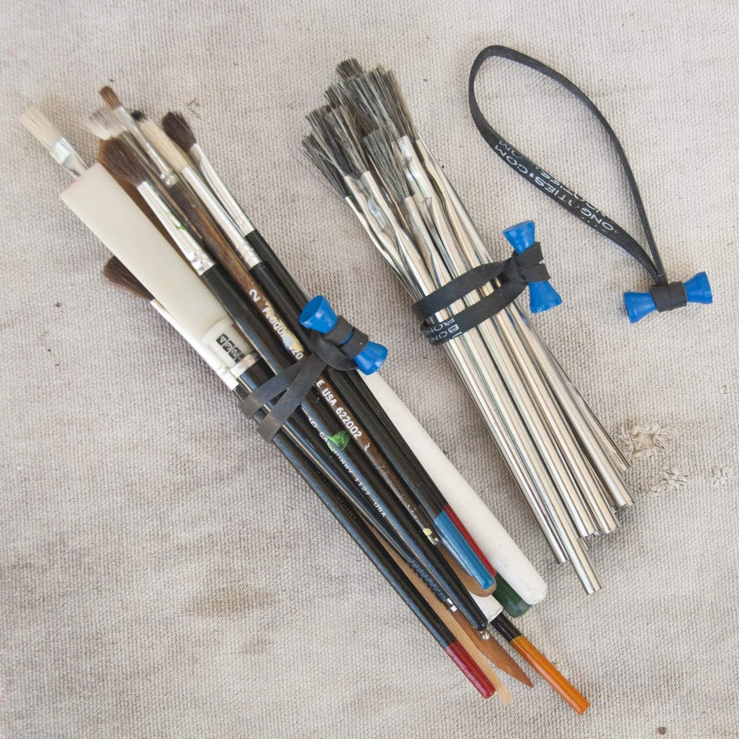 BongoTies are professional quality all purpose tie-wraps made of bamboo and natural rubber, with HUNDREDS of handy uses around the home, office, and workshop – Organize computer & TV cables, appliance & power tool cords, chargers & adapters, holiday lighting, tying down tarps, putting up banners, clamping items while gluing, securing stuff to backpacks, bikes, and luggage — and much much more! Originally designed as a quick and sturdy cable tie for photographers, movie grips, and sound technicians, BongoTies have become a trusted staple item in Hollywood, and in countless professional studios worldwide