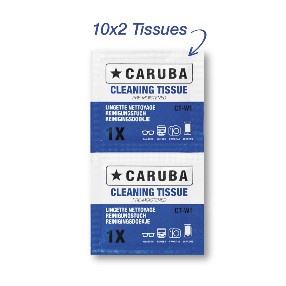 The universal Caruba Cleaning Kit is used to clean your lens, display, camera monitor or glasses. The Lens Blower is convenient to blow away dust, dirt or sand grains from your lens, camerabody or binoculars. He can also reach difficult corners. Blowing away dirt keeps scratching to a minimum. The Lens Brush is is equipped with a soft retractable brush. The Microfiber Cloth removes fingerprints, dirt and dust effectively. This cloth is washable. The Pre-moistened Cleaning tissues are pre-moistened with a special liquid, which removes grease and stains effortlessly! (Single use). The Cleaning Spray (Alcohol Free) is ideal for a streak-free cleaning of your camera lens or other equipement. Spray the fluid on a microfiber tissue and wipe clean!