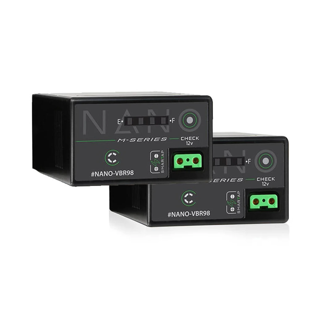Features of the Nano-VBR98 include a push button, four-LED power gauge, and compatibility with OEM battery chargers. When fully charged, this battery has an average runtime of 5 hours based on the draw of a Panasonic EVA1.