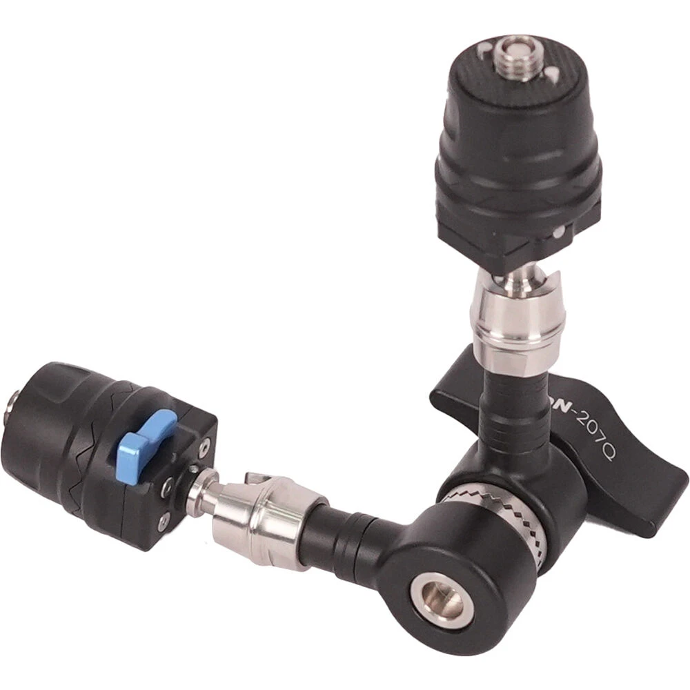 The 11″ IRONMAN Cine Magic Articulating Arm with Quick Release Mount by DigitalFoto Solution Limited is a versatile tool for seamlessly incorporating fill lights or secondary monitors into your camera setup. Its dual ball head configuration allows for flexible positioning, while the quick-release mounts enable effortless switching between accessories. The mounts include a 1/4″-20 screw with an ARRI anti-twist pin and a retractable 3/8″-16 screw adapter, ensuring broad compatibility. Additionally, a cold shoe with a 1/4″-20 thread enhances mounting options. Built from durable stainless steel, this arm can support up to 11 lb, making it suitable for most accessories and providing reliable performance for various shooting needs.