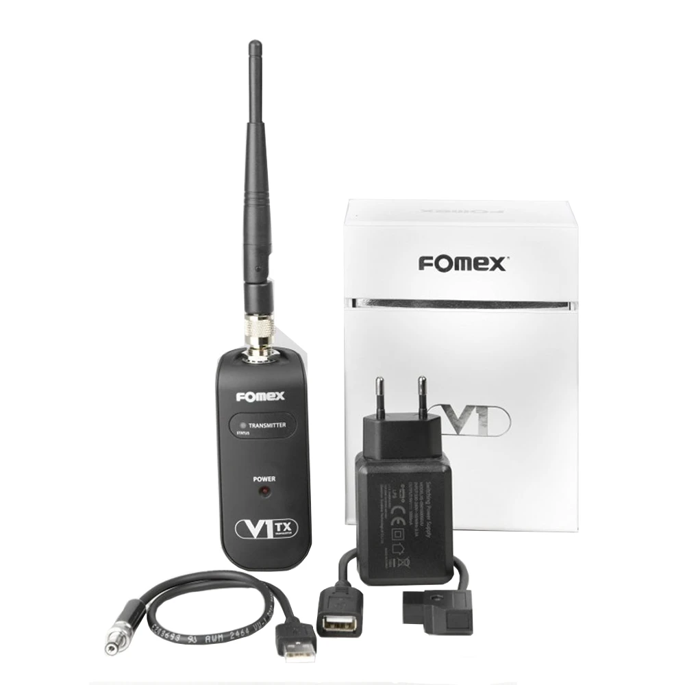 This requires the V1-RX receiver, which is connected to the transmitter at the push of a button. Wireless communication takes place via Lumen Radio CRMX at the licence-free 2.4 GHz frequency over a distance of up to 400 m. The transmitter is operated via the supplied AC adapter or via USB.