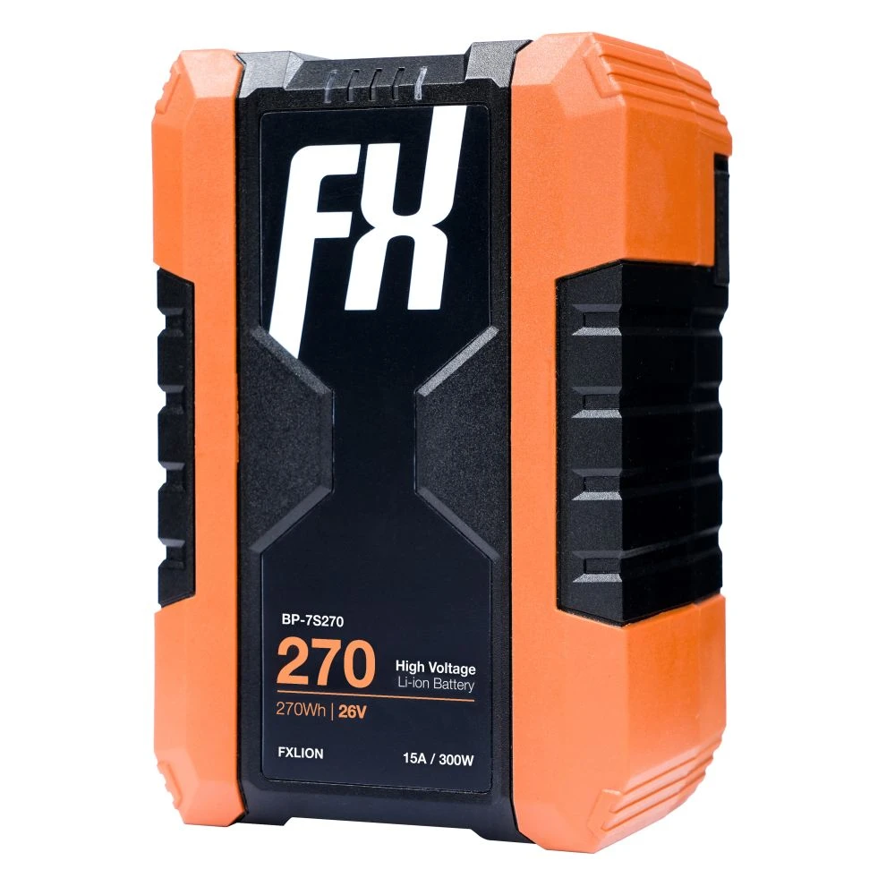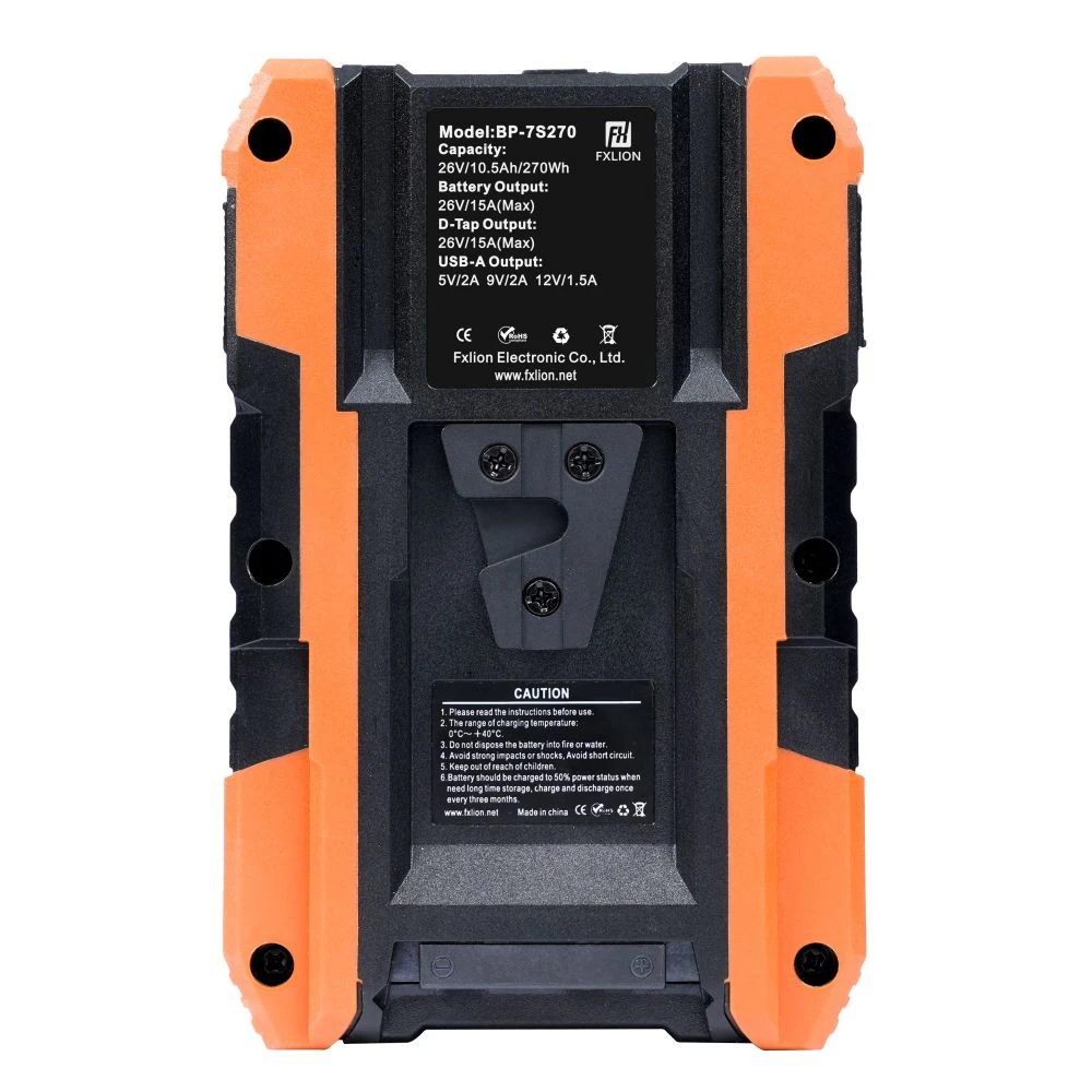 The Fxlion 26V / 270Wh V-Mount Battery is compatible with equipment requiring inputs between 18 and 30VDC. It features internal protection chips to prevent overheating, overloading, over-discharging, and over-current, ensuring safe operation.