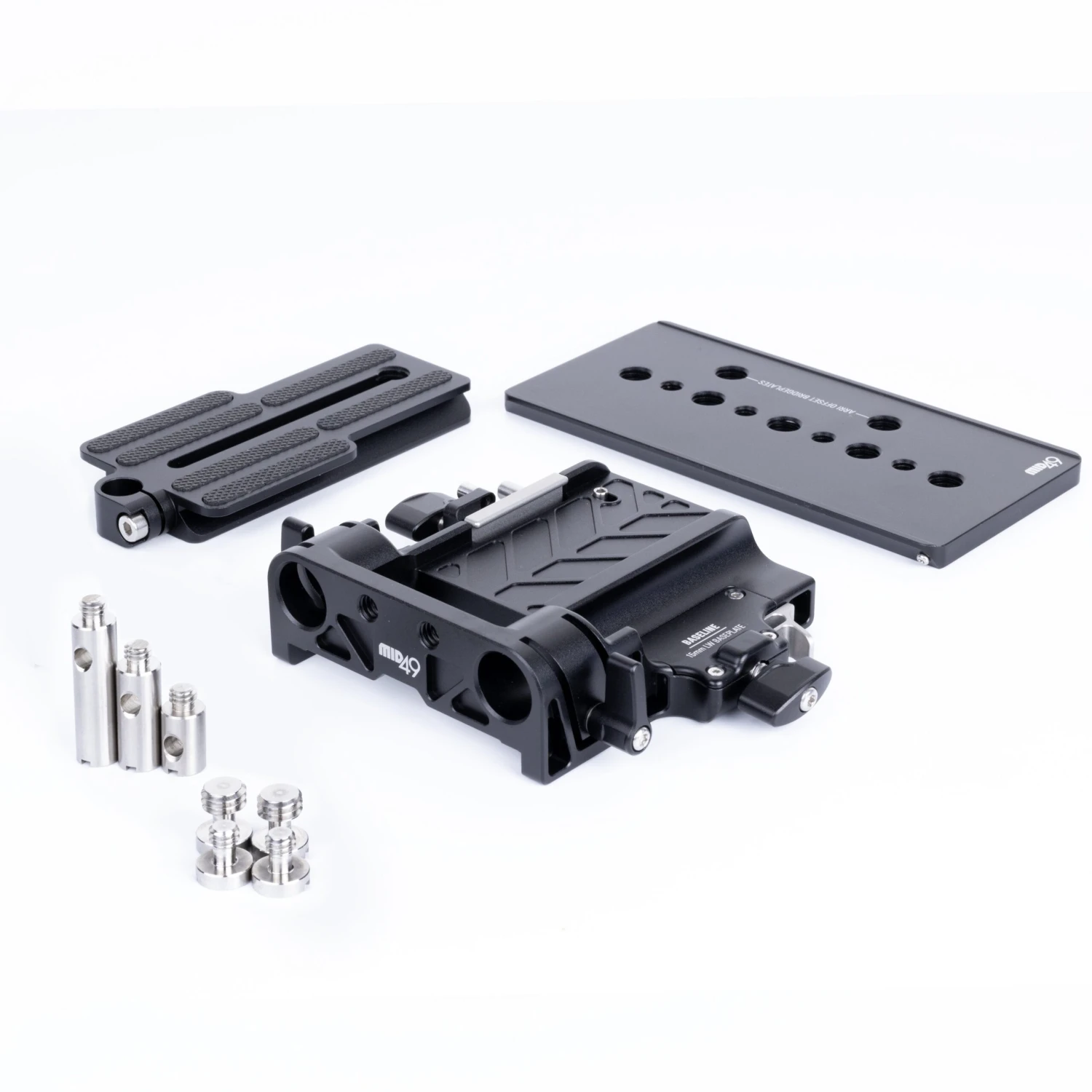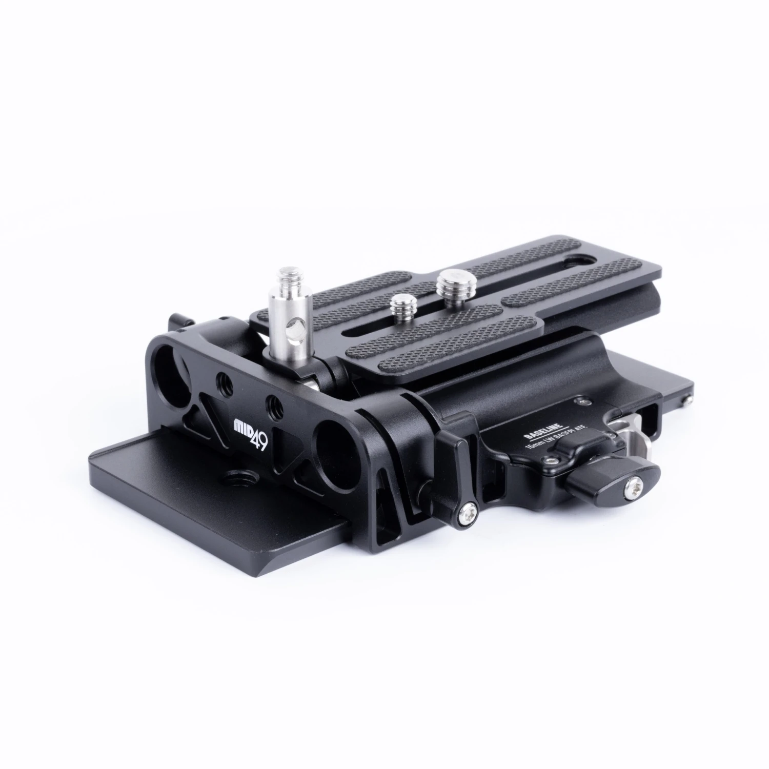 The MID49 Baseline 15mm LW Baseplate for Select Sony & Blackmagic Cameras features an Arca-type dovetail baseplate with integrated 15mm LWS rod clamps, an ARRI-compatible dovetail mounting plate, and an Arca-type dovetail. It is specifically designed for use with Sony cameras such as the BURANO, FX6, VENICE, VENICE 2, Rialto, F55, and F5, as well as Blackmagic Design’s URSA Mini, Mini Pro, and Mini Pro 12K. This baseplate ensures the proper lens center-to-rod height for cine-style accessories. It also includes a top-loading Arca-type dovetail slot for mounting from either the top or back, and the bottom of the platform can be mounted on the provided ARRI dovetail rails either through a top-loading mechanism or by sliding it on or off from the back.