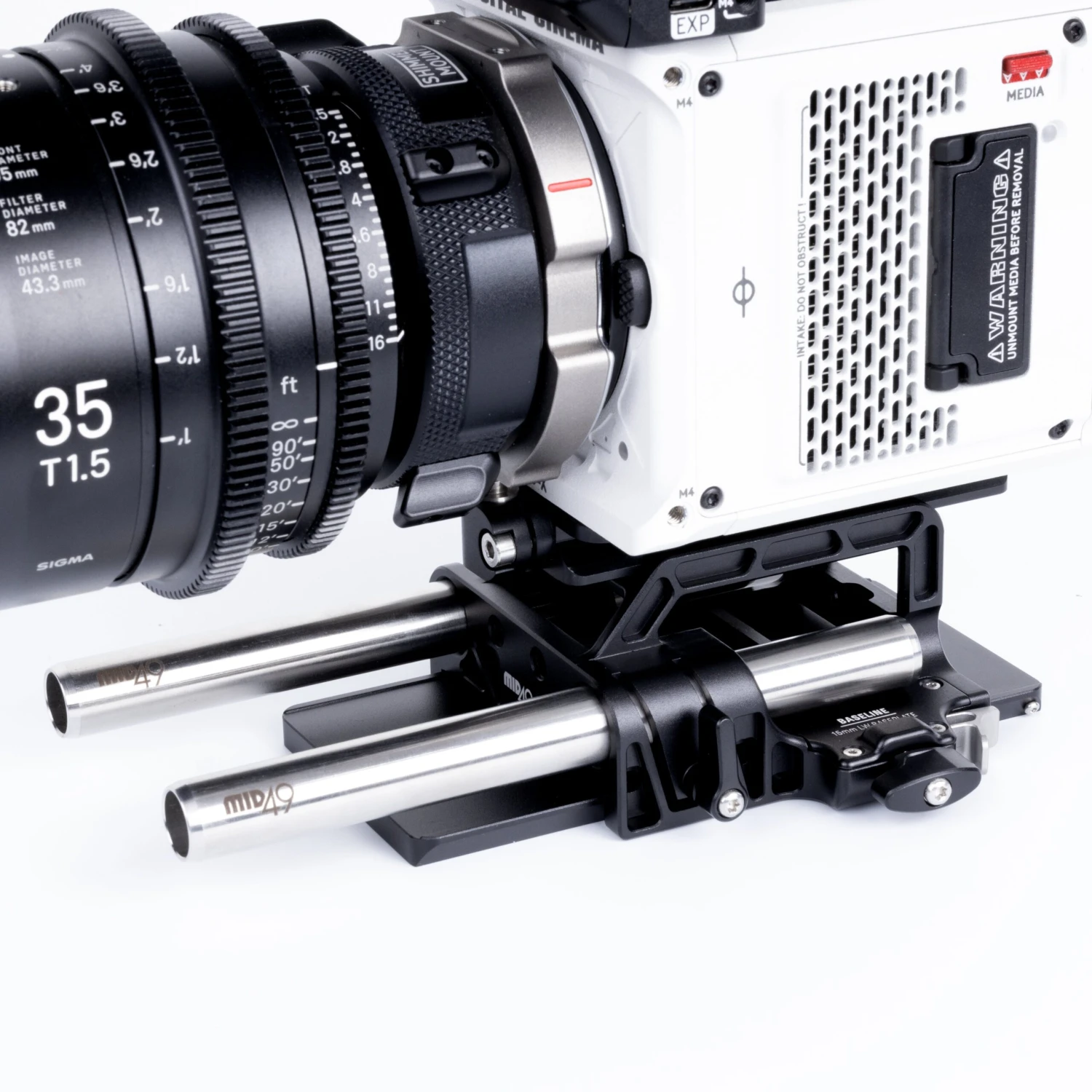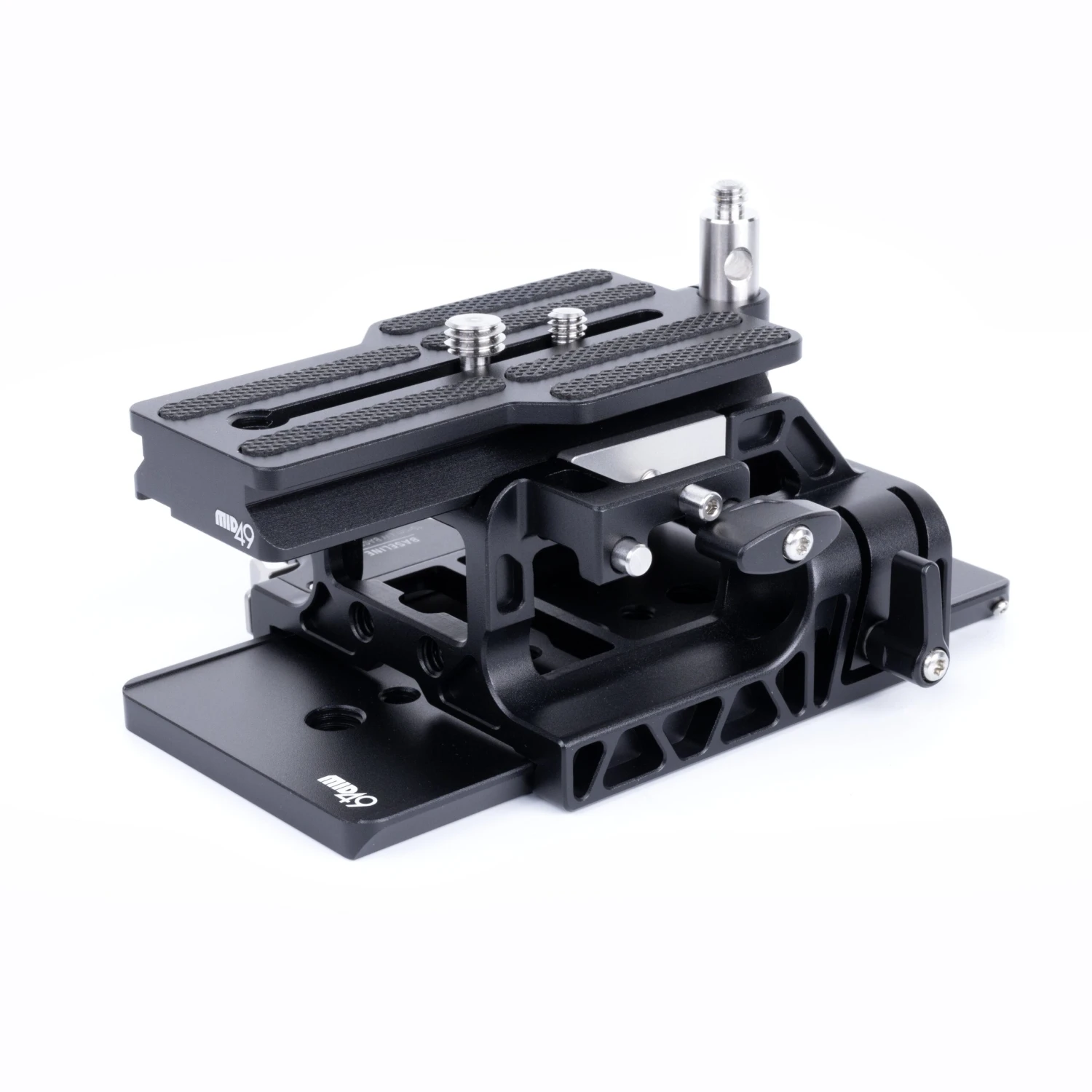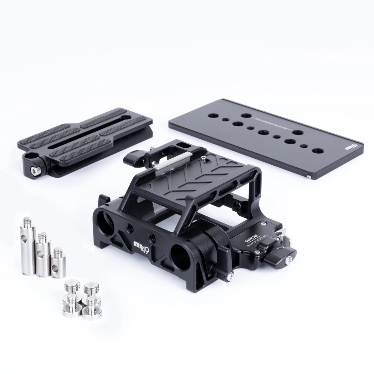 The MID49 Baseline 15mm LW Baseplate features an Arca-type dovetail baseplate with integrated 15mm LWS rod clamps and an ARRI-compatible dovetail mounting plate. Designed for the RED KOMODO, KOMODO-X, Blackmagic Pocket 4K, and FREEFLY Ember S5K cameras, it ensures the correct lens center-to-rod height for cine-style accessories. The baseplate includes a top-loading Arca-type dovetail slot, allowing for mounting from either the top or back. Additionally, the bottom of the platform can be mounted on the included standard ARRI-compatible dovetail rails using a top-loading mechanism or by sliding it on or off from the rear.