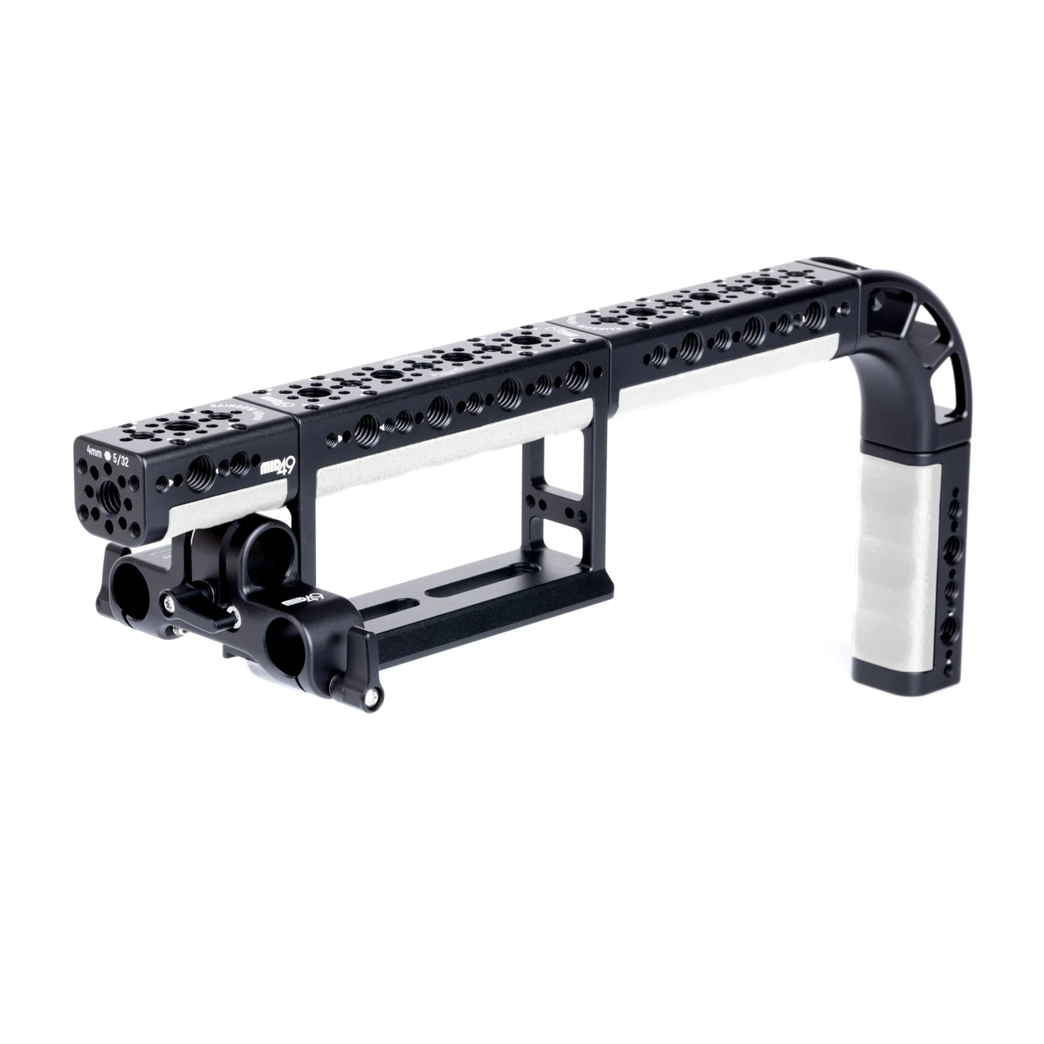 The Mid49 Rainbow Handle Kit is a versatile, modular handle system that can be configured in various ways, including the classic Hollywood or Panavision-style handle, which bends behind the battery. Each component is compatible with any 3/8″-16 ARRI accessory mount, and the anti-twist pins ensure the handle components are securely locked with no play. The system features 1/4″-20 and 3/8″-16 threaded holes with anti-twist divots, as well as multiple M4 x 20mm threaded holes. The rubberized grip can be easily popped out and replaced with another color for customized color coding. The main handle section includes an Arca-Swiss dovetail shape, allowing compatibility with any MID49 Top Plate or Upper Cage, as well as many third-party Arca clamps.