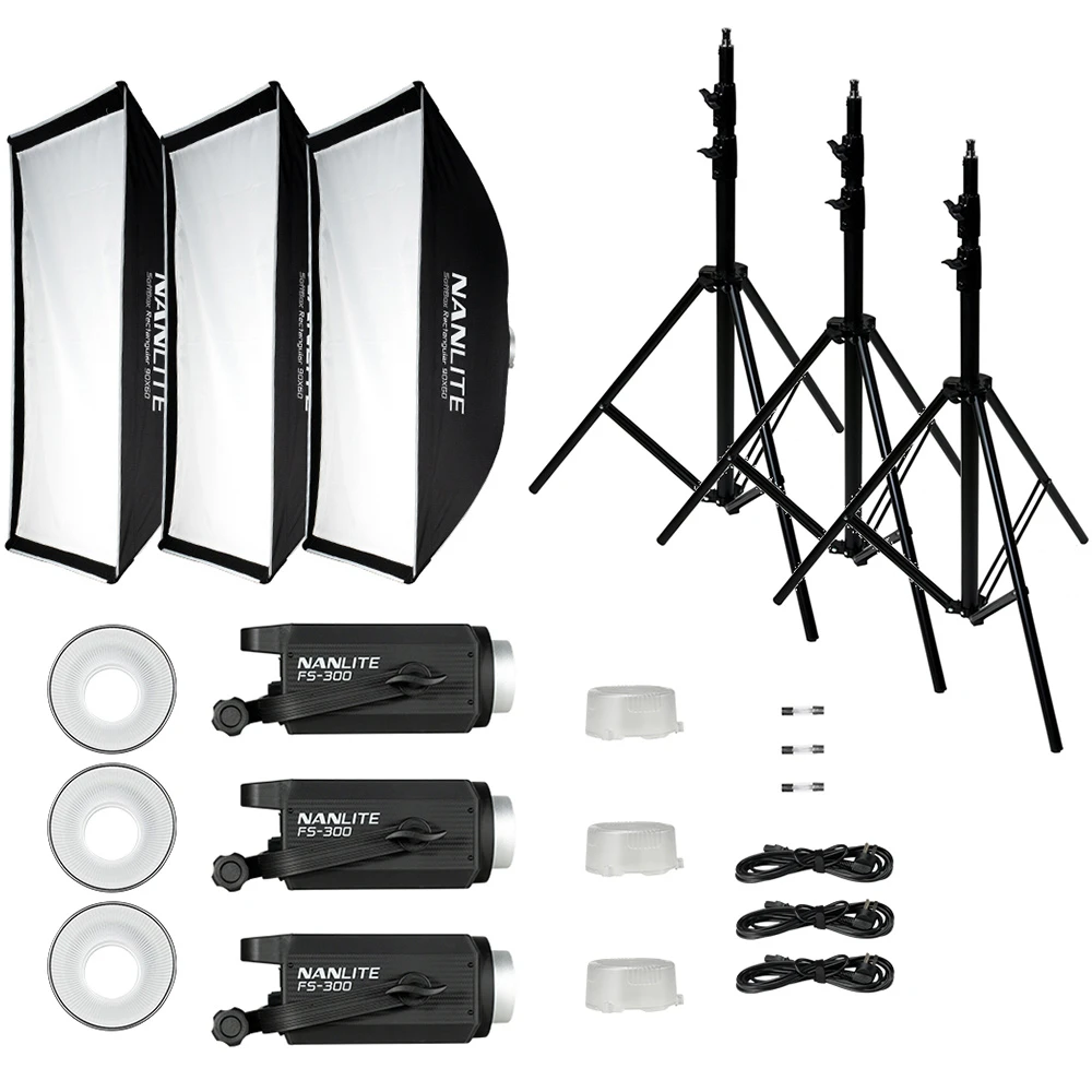 Nanlite FS-300 3-Light studio kit for both video and photgraphers who require studio-quality light. The kit includes two FS-300 LED Monolights, each with a 90×60 Softbox and a 55 degree reflector. 3 light stands – LS 186 and a carrying case.