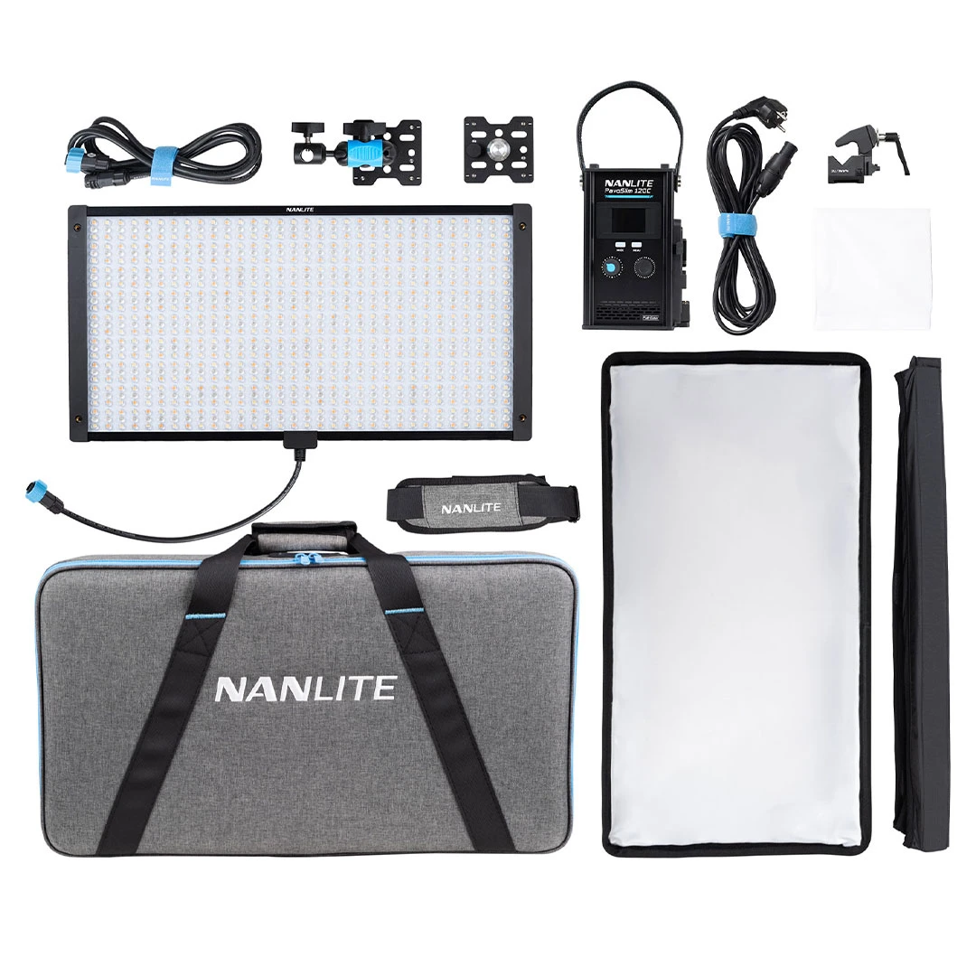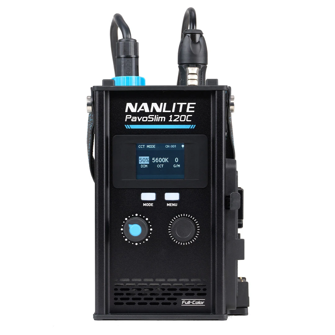 The Nanlite PavoSlim 120C is an exceptionally thin and lightweight 2×1 RGBWW LED panel light that provides impressive output (12830 lux, 1192 fc @1M 5600K), 0–100% dimming, a bi-color CCT range of 2700K–7500K with G/M adjustment of +/- 150, built-in CRMX LumenRadio, power through AC or V-Mount battery, and includes a Control Unit, super clamp, softbox, 2 sets of diffusion, eggcrate grid, a swivel mount, a baby-pin mount, and a compact padded carrying case that safely holds everything.