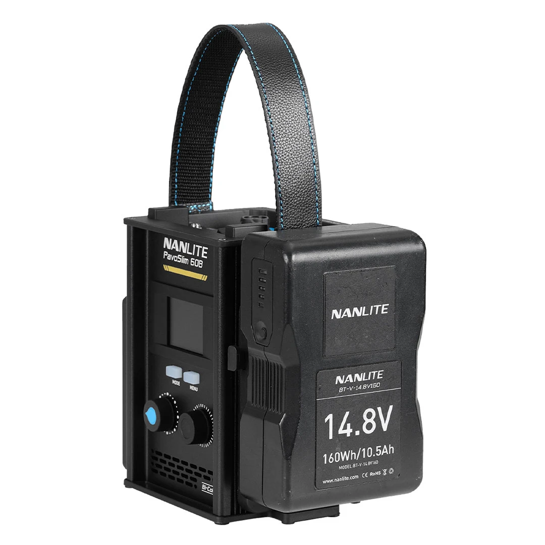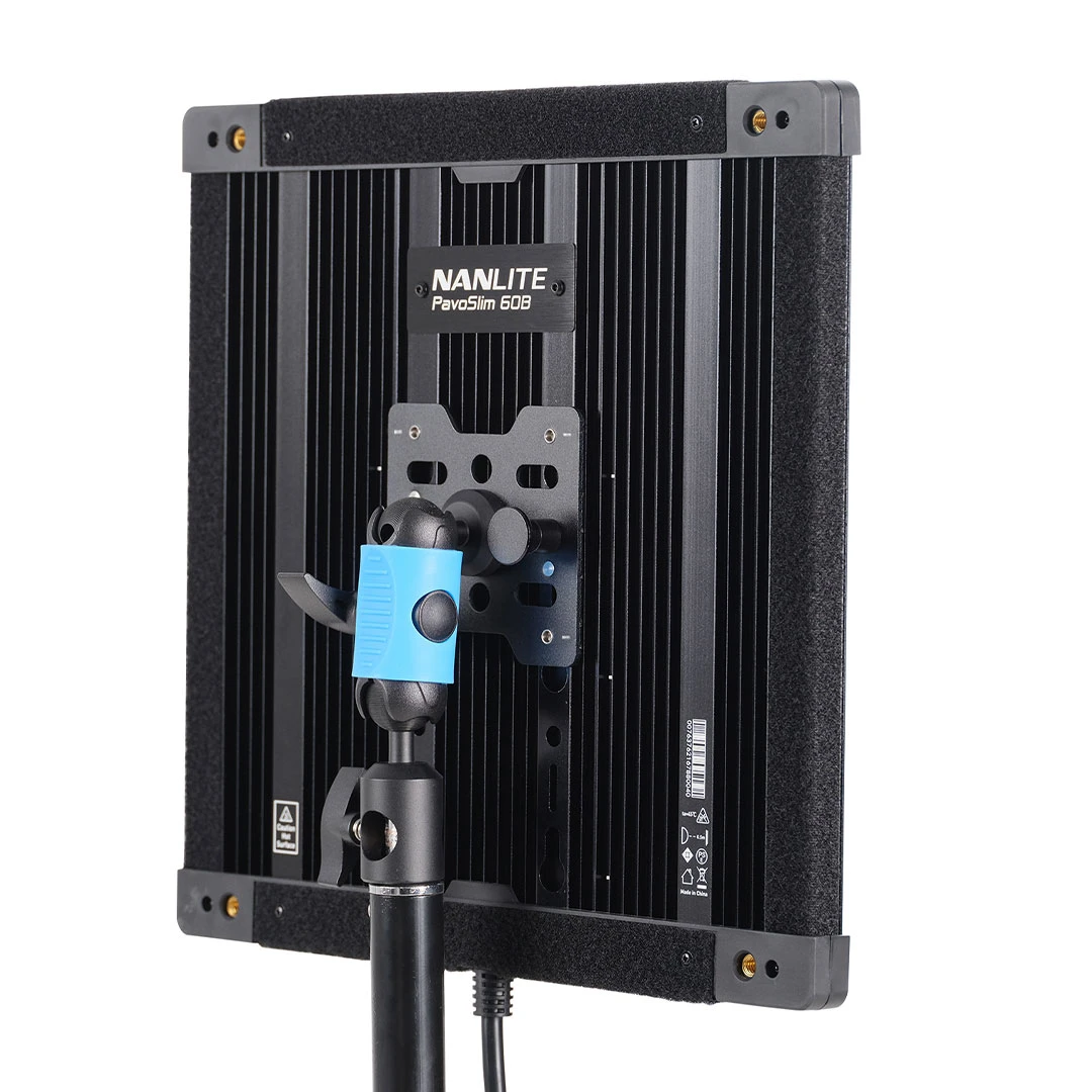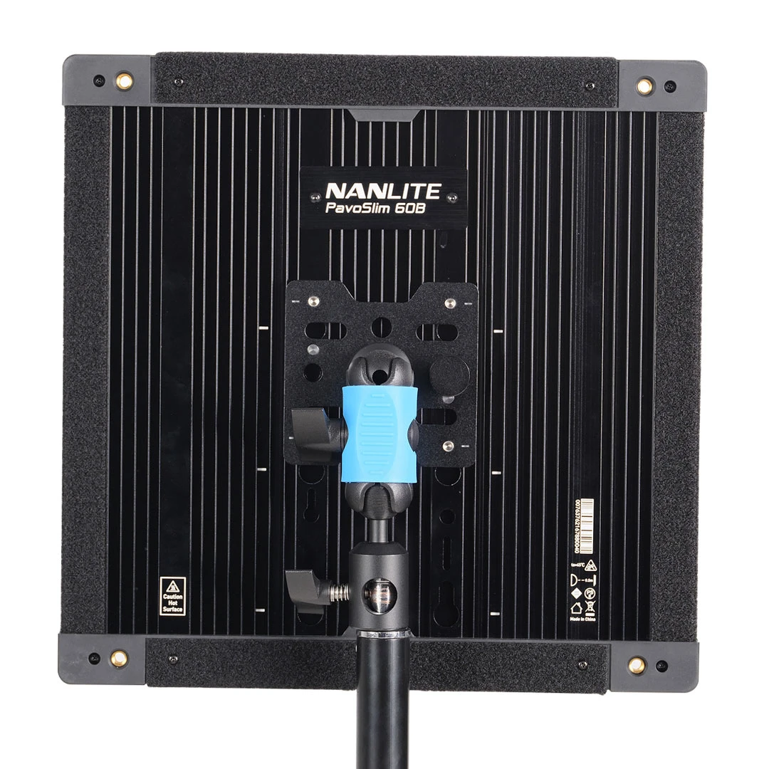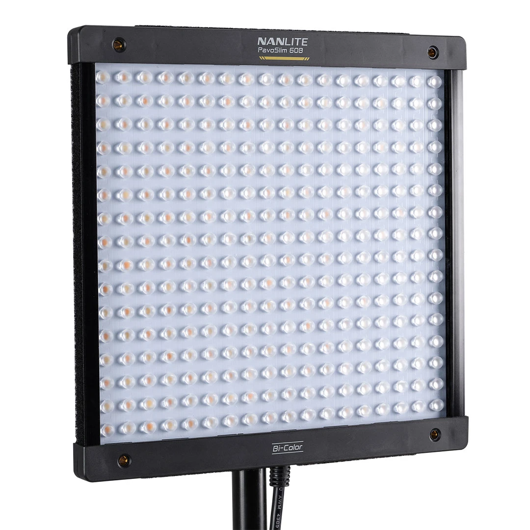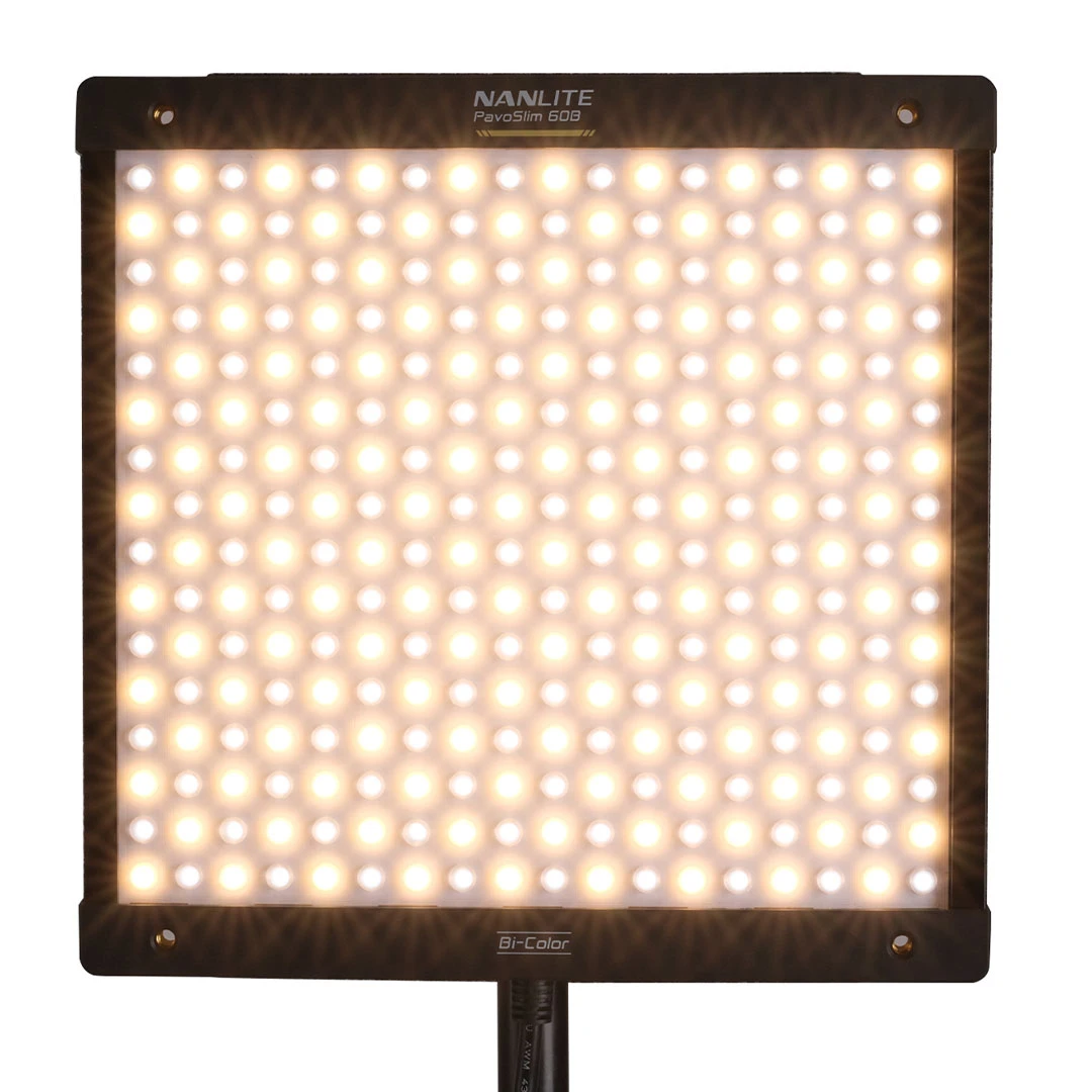 The Nanlite PavoSlim 60B is an exceptionally thin and lightweight 1×1 LED panel light that provides impressive output (8156 lux, 757.7 fc @1M 5600K), 0–100% dimming, a bi-color CCT range of 2700K–6500K, power through AC, NP-F or V-Mount battery, and includes a Control Unit, softbox, 2 sets of diffusion, eggcrate grid, a swivel mount, and a compact padded carrying case that safely holds everything.