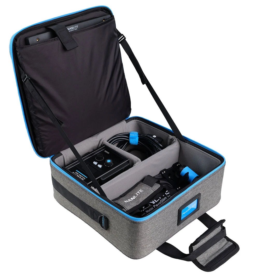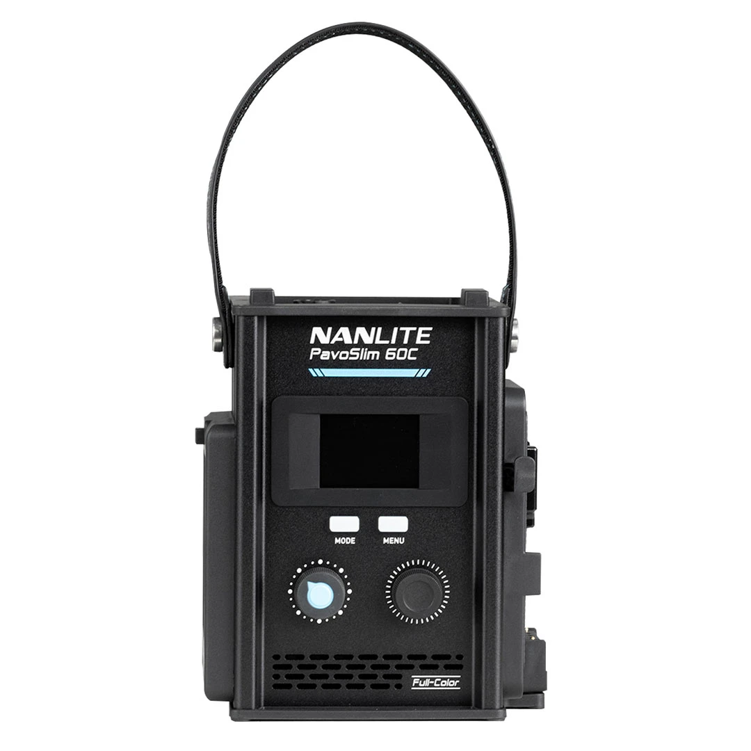 The Nanlite PavoSlim 60C is an exceptionally thin and lightweight 1×1 RGBWW LED panel light that provides impressive output (7074 lux, 657.2 fc @1M 5600K), 0–100% dimming, a bi-color CCT range of 2700K–7500K with G/M adjustment of +/- 150, built-in CRMX LumenRadio, power through AC, NP-F or V-Mount battery, and includes a Control Unit, super clamp, softbox, 2 sets of diffusion, eggcrate grid, a swivel mount, a baby-pin mount, and a compact padded carrying case that safely holds everything.