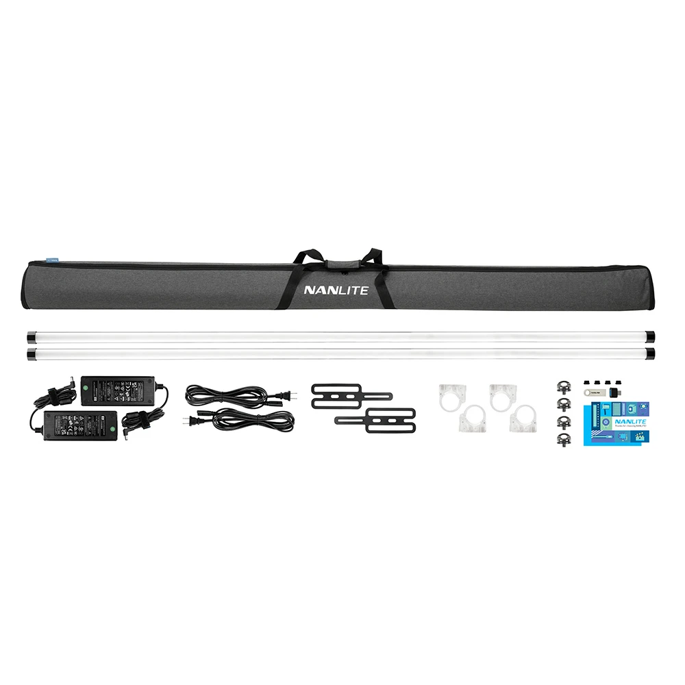 Nanlite 8′ PavoTube II 60x RGBWW LED Pixel Tube 2-Light Kit. Each tube has two modes. In CCT mode the tube has an impressive variable color range of 2700 to 12,000K to deal with any ambient light situations, match other fixtures, or spark creativity. It also has an RGB mode which allows hue, saturation, and intensity adjustments, giving you access to literally millions of custom colors. While you can make adjustments to the light on the fixture, you can also make them remotely via a DMX console. Additionally, the PavoTube has special effects that include hue loop, CCT loop, INT loop, CCT flash, and hue flash, CCT pulse, hue pulse, storm, police car, TV, paparazzi, candle/fire, disco, bad bulb, firework, explosion, and welding.