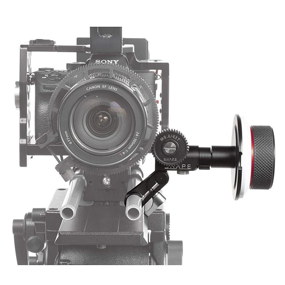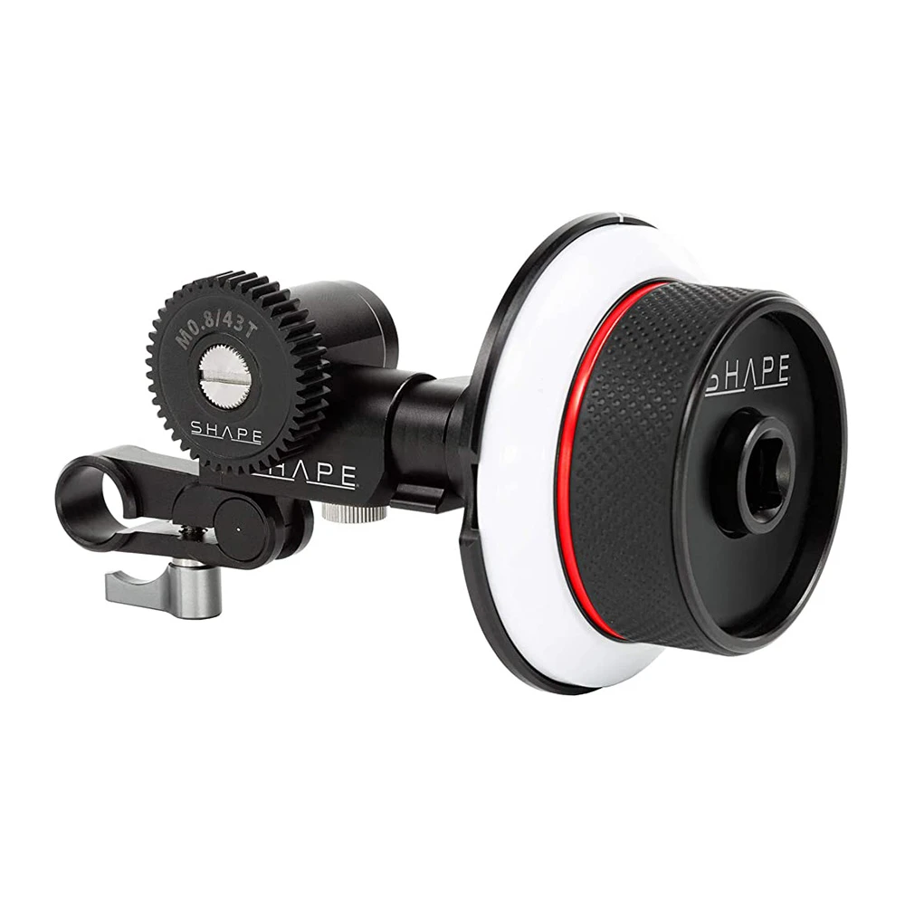 Use the compact SHAPE Follow Focus Kit with Single 15 mm Rod Clamp with your camera setup to make focus pulling easy. The modular design allows you to add and remove any of the components without screws or tools, and its small profile allows the addition of a matte box or accessories around your lens. At the core of the kit is a rubber, anti-slip follow focus wheels attached to a single aluminum 15 mm rod clamp. The clamp rotates to adjust to most lens sizes, and it’s tightened by a locking lever. The clamp’s rotation also allows the focus wheel to easily swing out of the way when changing lenses. Five drive gears are included to fit a variety of lens sizes: 0.5 MOD/78T, 0.6 MOD/64T, 0.8 MOD/38T, 0.8 MOD/43T, and 0.8 MOD/78T. The gears can be flipped from front to back to facilitate different lens configurations. A 49 mm rubber friction wheel is also included for the 0.5 MOD/78T gear which is most commonly used with DSLR lenses. For alternate fine-focus configurations, use the included speed crank or 11″ whip, both of which attach to the center point of the knob. Four magnetic marking disks are included to attach to the focus wheel.