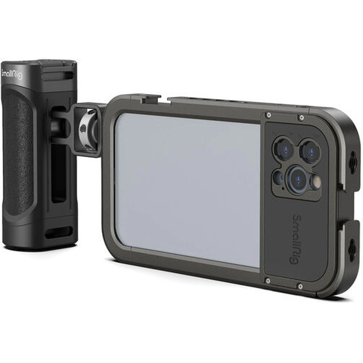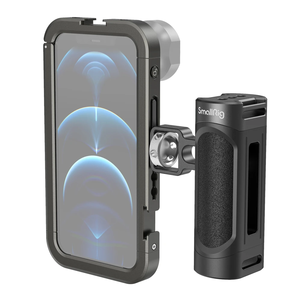 SmallRig Handheld Video Rig kit for iPhone 12 Pro 3175 is a perfect mobile phone video rig for vlogging, mobile filmmaking, commercials, etc. The kit comes with a cage specially designed for iPhone 12 Pro and a side handle for a more stable handheld phone shooting. It features two cold shoe mounts and multiple 1/4 threaded holes to attach accessories like a microphone, a LED light, a tripod, etc. It supports both horizontal shooting and vertical shooting. The lens mount on the back enables you to attach an external lens to your phone easily.