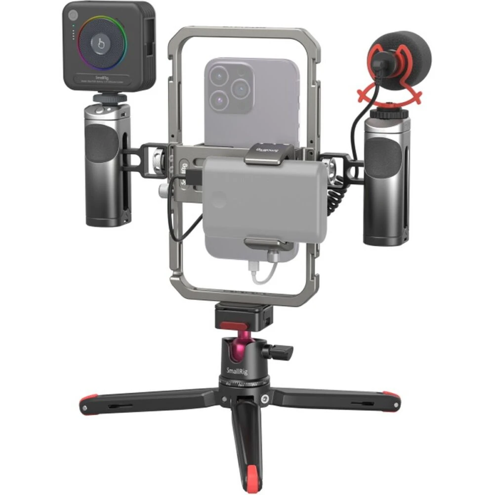 The SmallRig All-in-One Video Kit Ultra is a professional solution for smartphone vlogging, live streaming, and more. This bundle includes a mobile phone cage, power bank holder, quick-release tripod, two side handles (one with wireless control), the Vibe P108 RGB Video Light, and the Wave S1 Lite on-camera microphone. Also included is a carrying bag, a shock mount, windscreens for the microphone, cables, Allen wrenches, and cable ties.Enhance your handheld recording experience with dual handles that increase stability for more dynamic shooting. The one-click wireless control lets you start recording immediately, adding convenience to your workflow. The quick-release ball head enables you to switch between handheld and tripod shooting effortlessly.Ensure worry-free recording with easy charging by attaching external power banks (not included) for long battery life. The one-piece aluminum alloy cage is fully expandable, featuring multiple expansion interfaces for attaching a microphone, video light, side handles, top handle, tripod, and more. It includes twelve 1/4″-20 threaded holes and four cold shoe mounts for versatile customization.The Vibe P108 RGB Video Light is a powerful companion with stepless color temperature adjustments, a high CRI of 95, and the capability of 36,000 RGB colors. It runs up to 130 minutes on a single charge, offering flexibility with adjustable color temperature, brightness, and colors through a stepless, one-handed knob. Three cold shoe mounts allow attachment of other lights or accessories.The Wave S1 Lite on-camera microphone delivers clear recordings with pure vocals. It is fully adaptable, compatible with mobile phones 2.2 to 3.5″ wide. The power bank holder is also adaptable, accommodating batteries 2.1 to 3.2″ wide. The kit comes with a convenient lightweight storage bag for added protection.This rig can be configured for one-handed or dual-handed shooting, making it ideal for live streaming, vlogging, and various creative pursuits. Elevate your smartphone content creation game with the SmallRig All-in-One Video Kit Ultra.