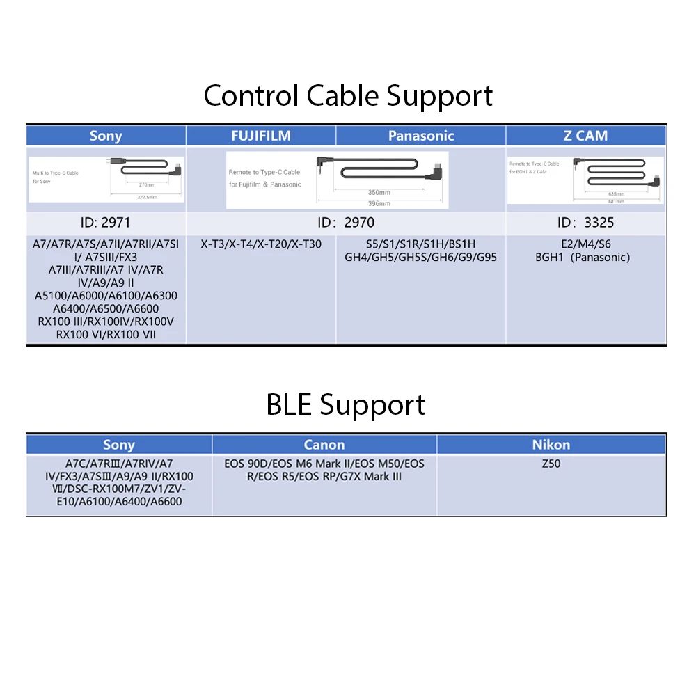 - BLE module for wireless REC start/stop, follow focus, and zoom. These functions can also be achieved with control cables (ID: 3325, 2971, 2970, depending on your camera type) when paired with the Wireless Receiver Motor.