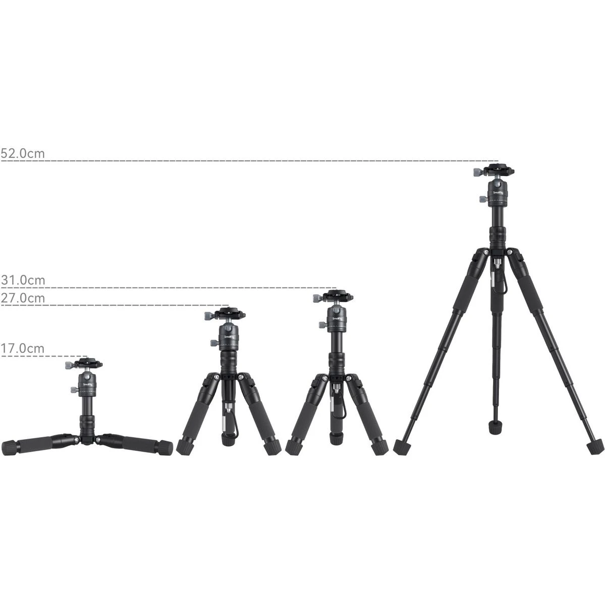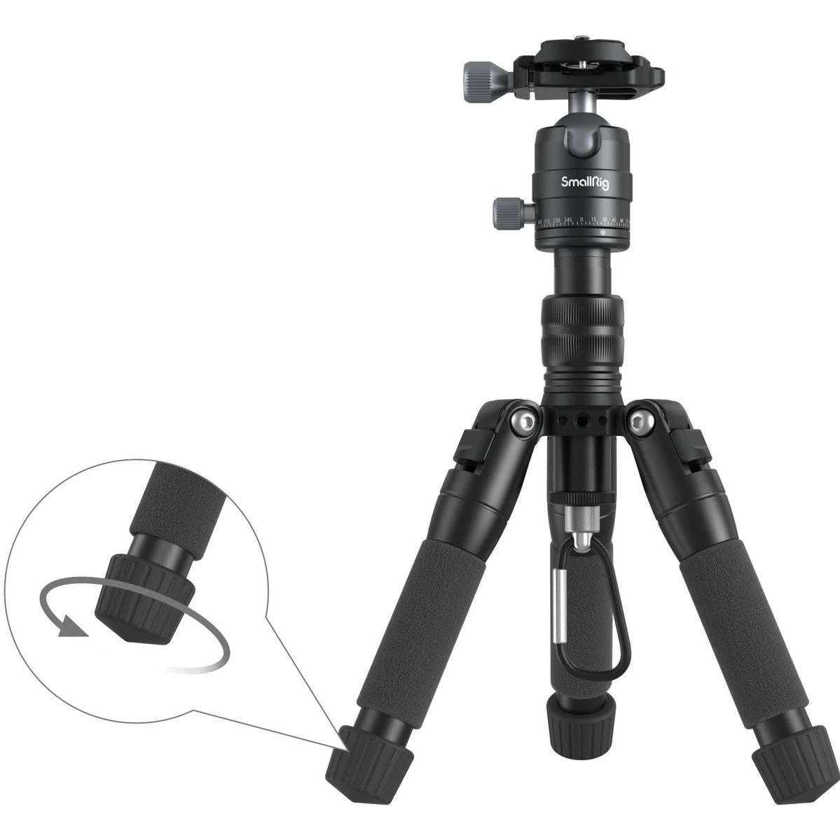 SmallRig Aluminum Mini Tripod VT-20 4289 is the perfect mini tripod for compact DSLRs, mirrorless cameras, smartphones, action cameras and other devices. Five-section legs with quick-tightening design extend the tripod to as high as 52cm and bear a load of up to 6kg. The tripod has a folded length of only 18cm and greater shooting stability, given its foldable aluminum alloy legs and center column design. The tripod features a lock knob for quick angle adjustment between three stops (23°/50°/80°), and an Arca-Swiss quick-release panoramic ball head on the top, which can swivel 360° and tilt 90° for a vertical shot. It also comes with 1/4″-20 threaded hole in leg joints for Magic Arm for microphone, monitor, picture transmission system, etc.