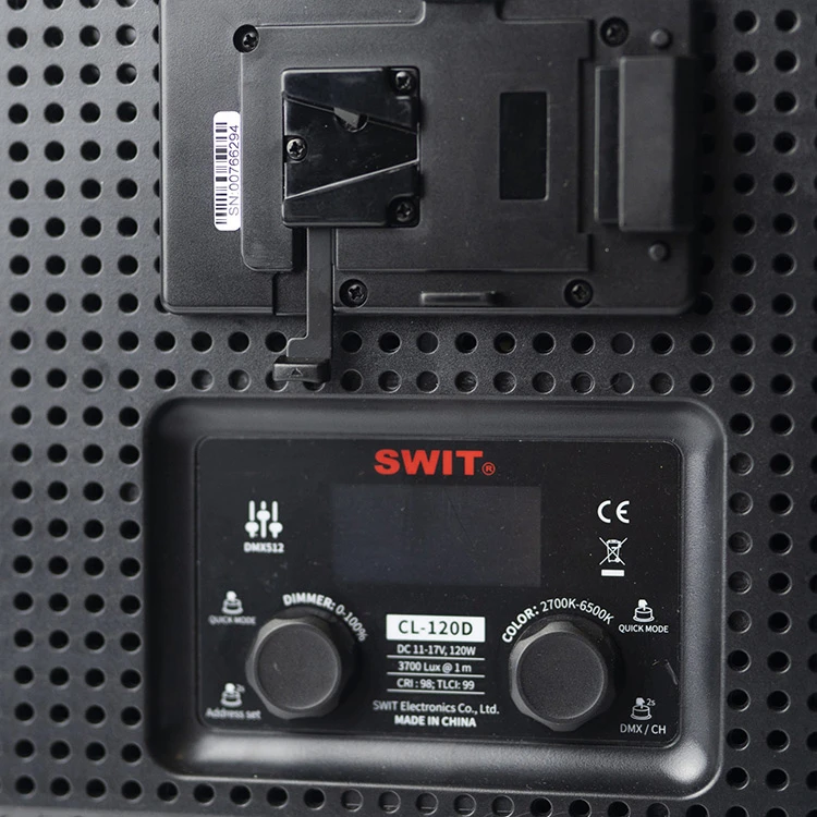 The Swit CL-120D is a 120 Watt LED panel light. It contains 1800 SMD LED lights that provide good illuminance, wider beam angle, higher display index, softer bright colors and longer life. This makes the CL-120D an ideal light source for broadcast studios, green screen, interviews and live streams. It has an LCD display where you can see the dimming percentage, color temperature, DMX channel, CH channel and battery indications. The CL-120D has a 65 degree wide beam angle. This is evenly distributed. The temperature is continuously adjustable between 2700K-6500K. This alternates between 2700K and 6500K by default. It is possible to adjust this yourself in steps of 50K.
