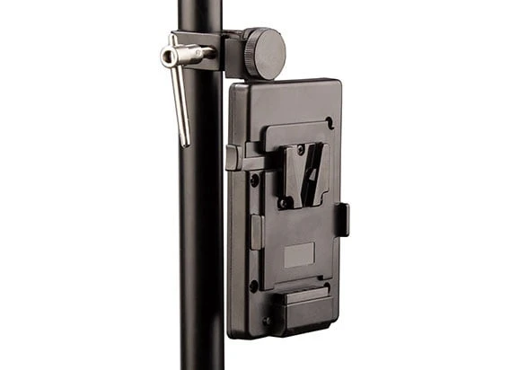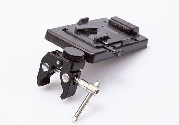 V-mount battery plate with clamp for tripod mount, and D-tap socket.