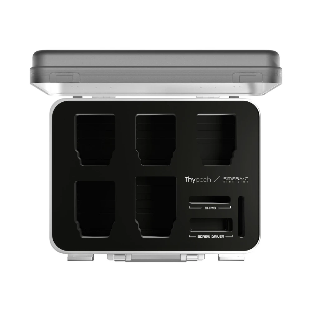 Expand your filmmaking toolkit with the Simera-C Cine 4-Lens Kit from Thypoch. This comprehensive set includes 28mm, 35mm, 50mm, and 75mm prime lenses, all equipped with a Sony E mount. Alongside the lenses, the kit provides essential accessories, including lens caps, shims, screws, and a screwdriver for precise shim adjustments.