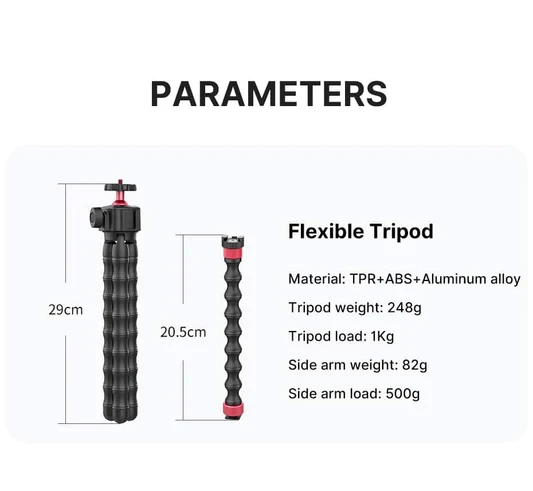- 2 flexible arms. Give your photos or videos better sound and image quality by adding a video light and/or microphone on the arms.