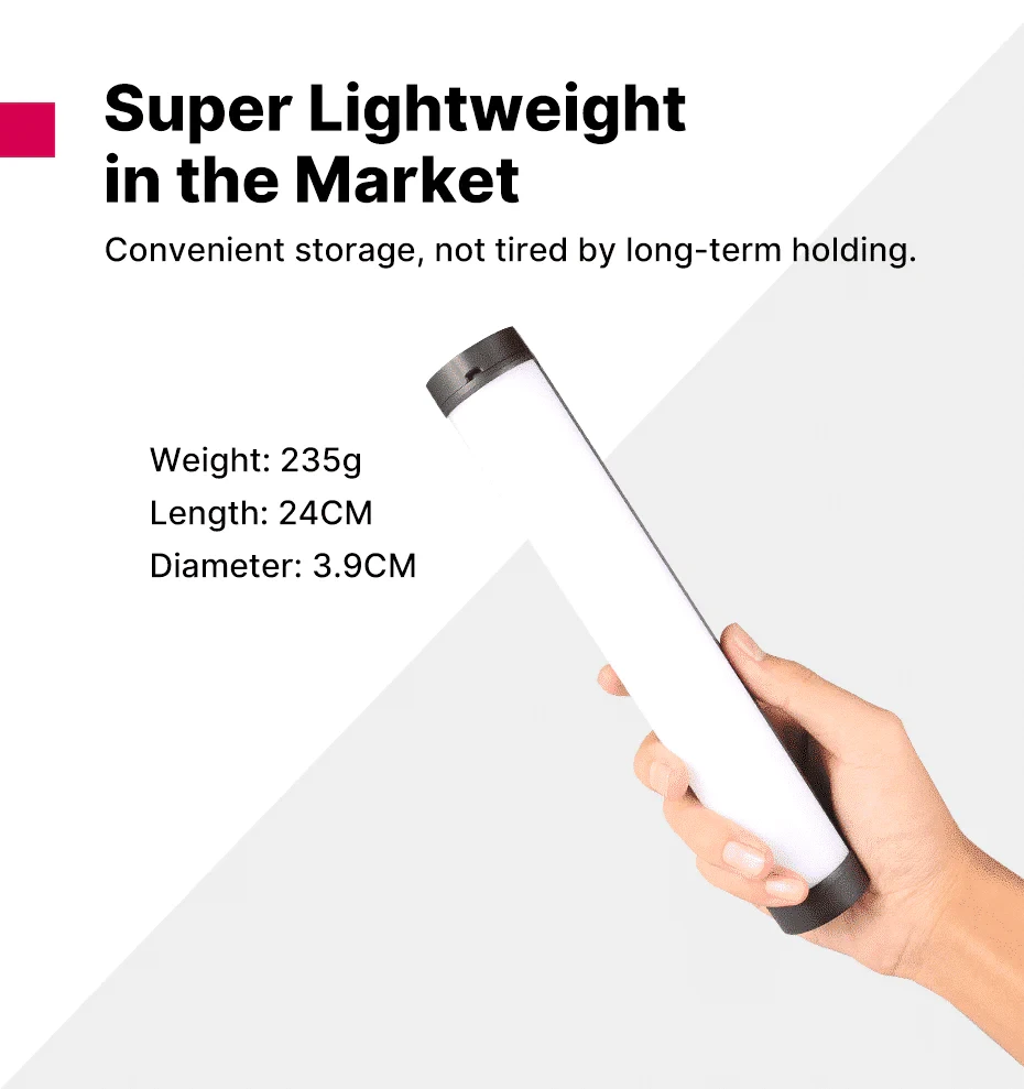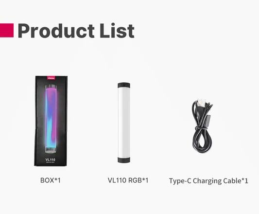 - Package contents RGB Tube light, USB-C charging cable, manual