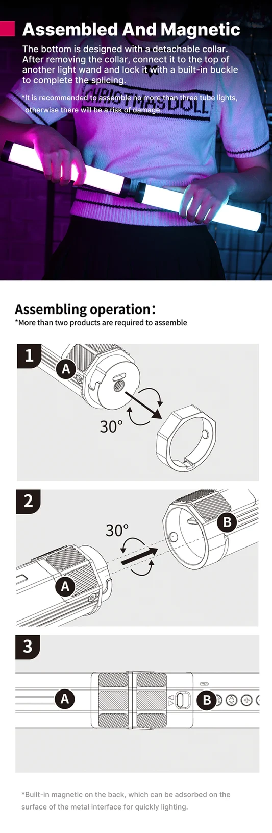 Detach the ring from the bottom of the tube to connect two tubes together for an extended stick, as illustrated in the instructions provided. Equipped with magnetic strips on both ends, the RGB tube light effortlessly adheres to metal surfaces for secure placement. Its handheld design also allows for convenient use as a light wand, providing versatility in various lighting setups.